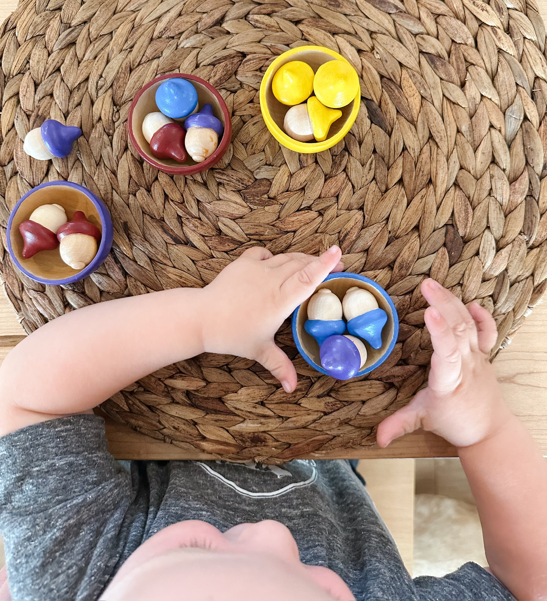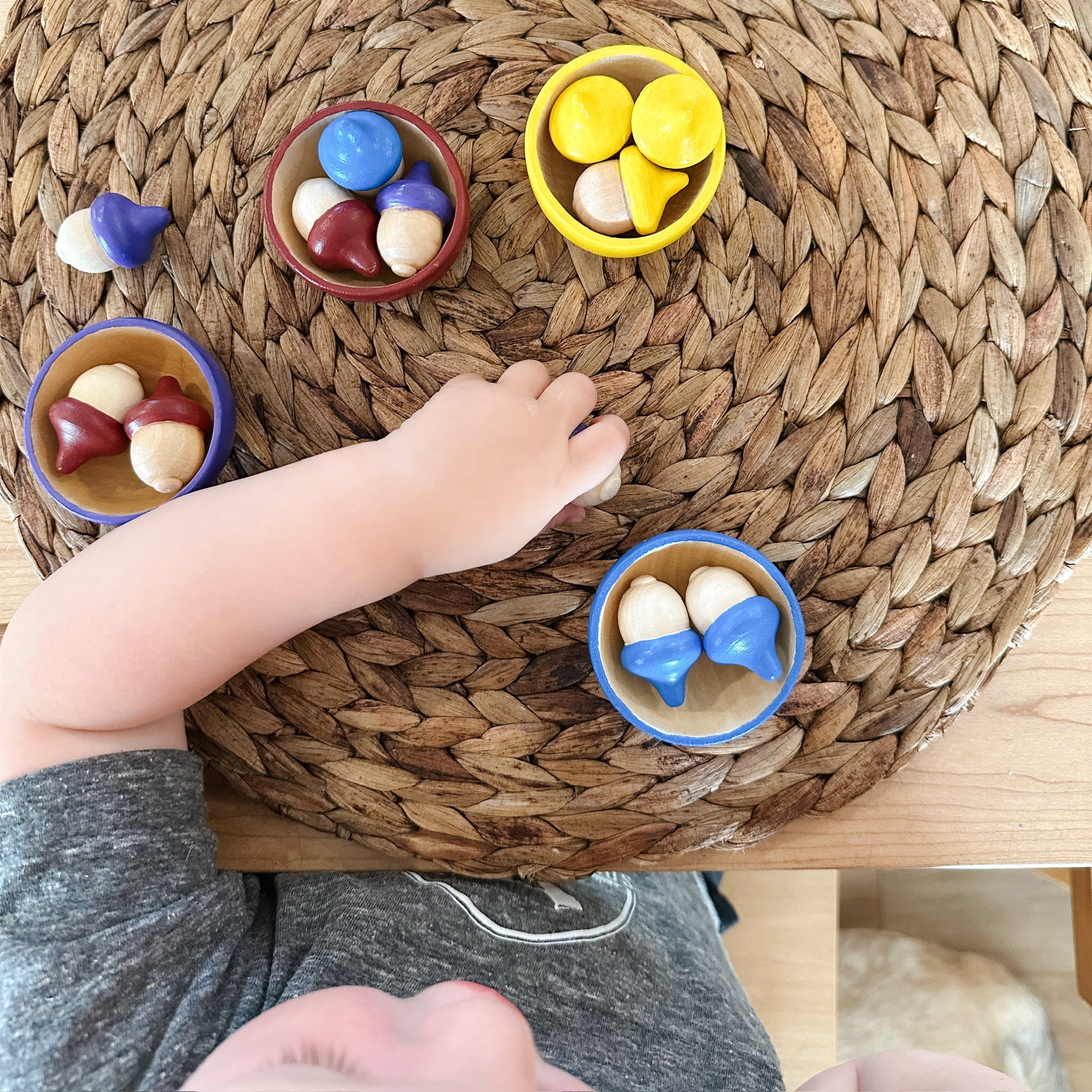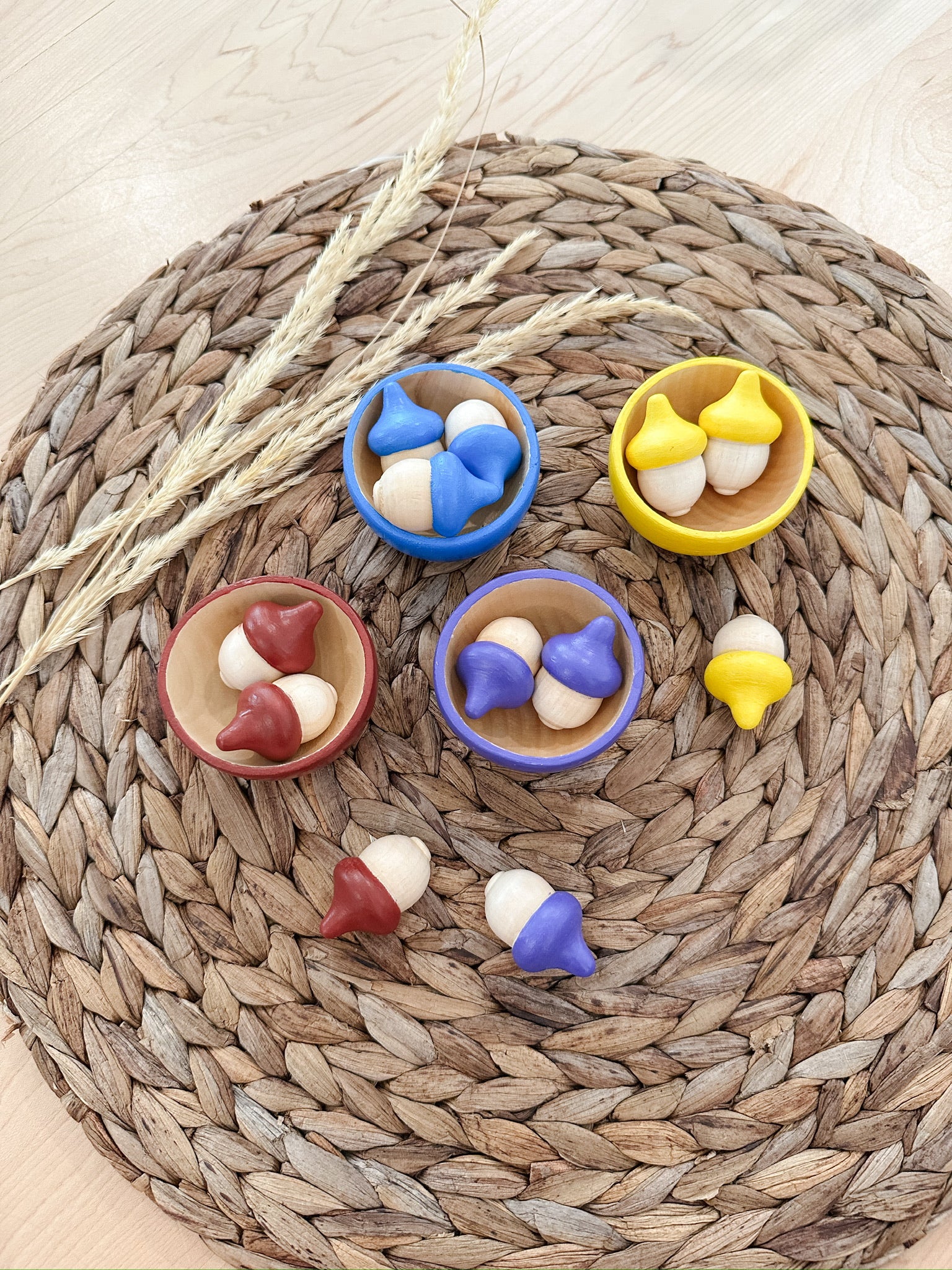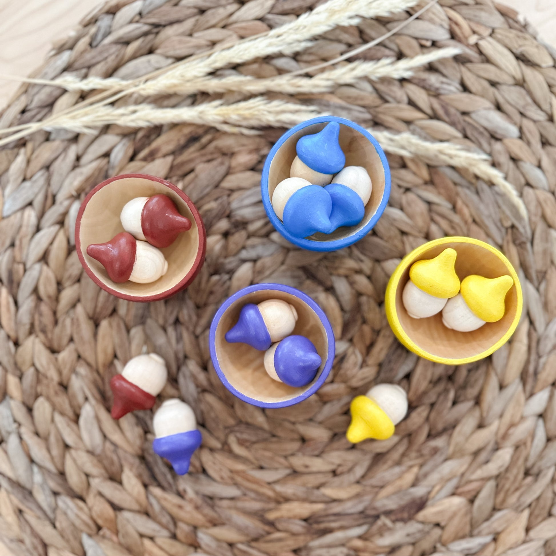 Count or sort these sweet little hand painted wooden acorns into the matching wooden bowls.
