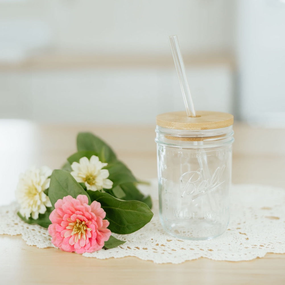 Wide mouth ball mason jar. 14 oz, with bamboo lid and glass straw set.