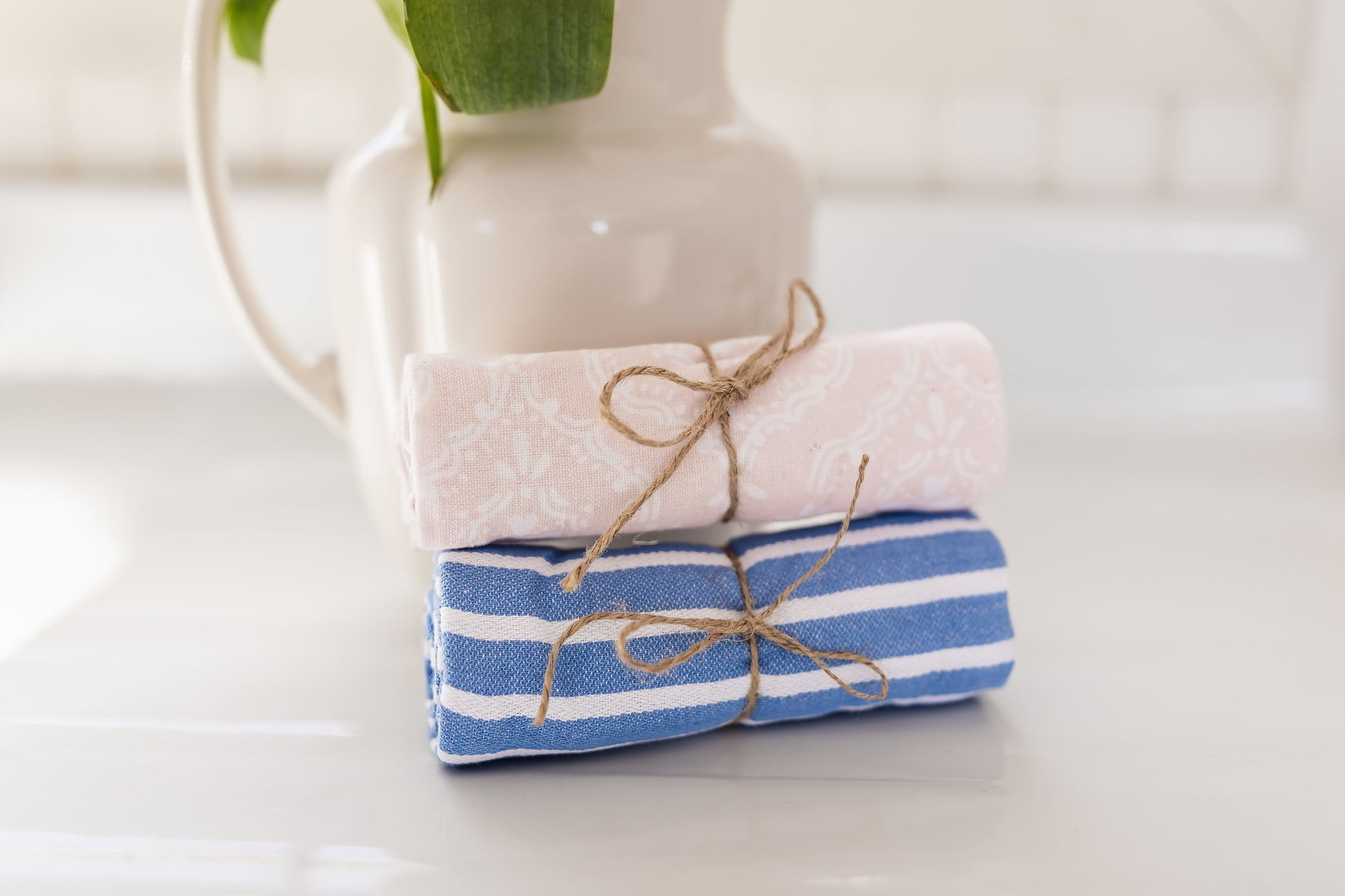 Set of 2 beautiful tea towels: one blue striped & one pretty pink print