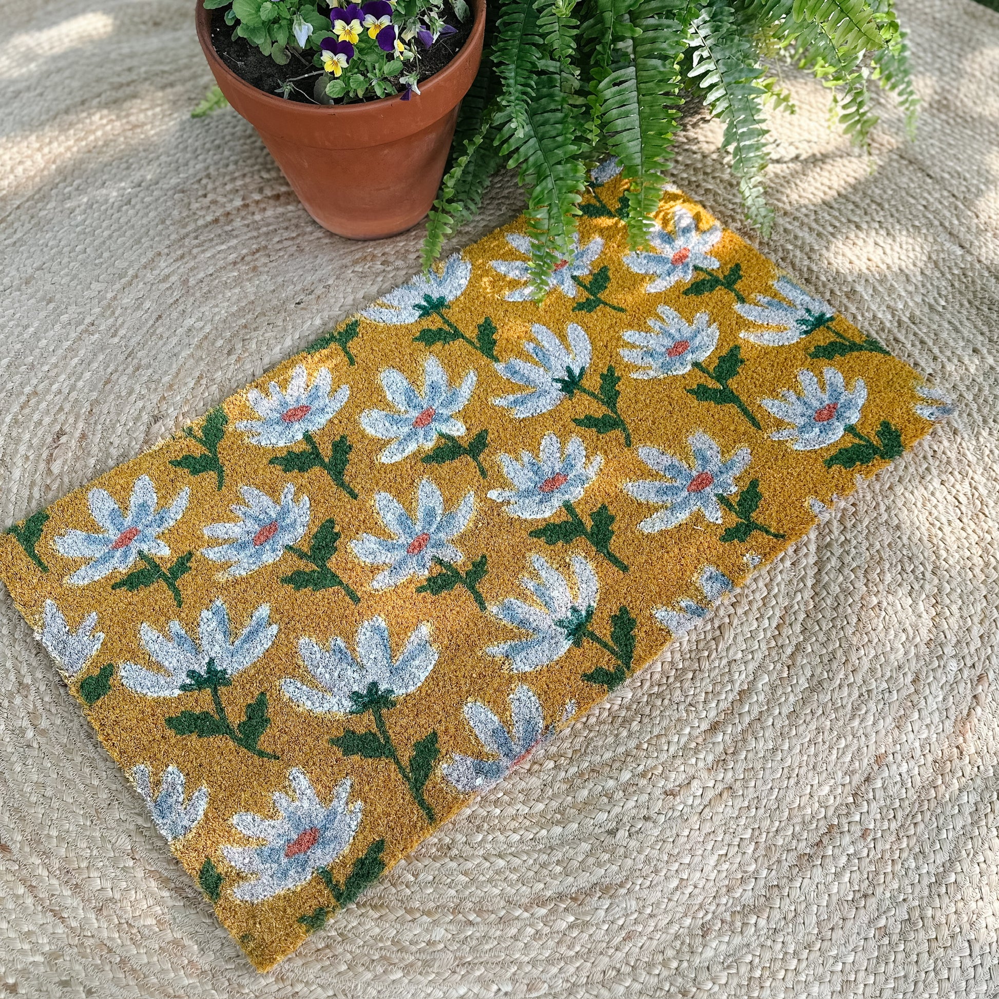 Made from natural coir fibers, the daisy welcome mat is durable, but to keep the design from fading, it is suggested to use in sheltered areas or indoors.