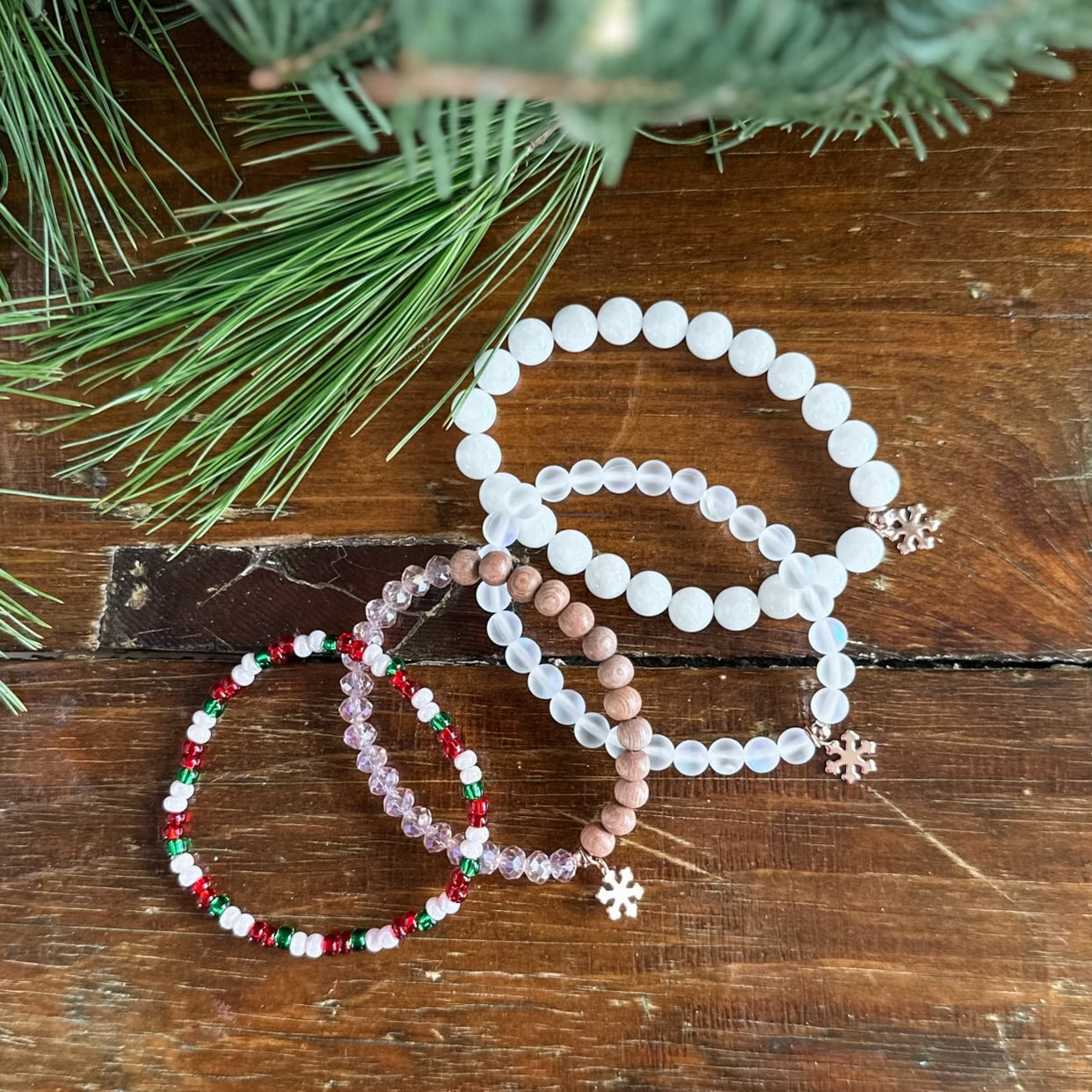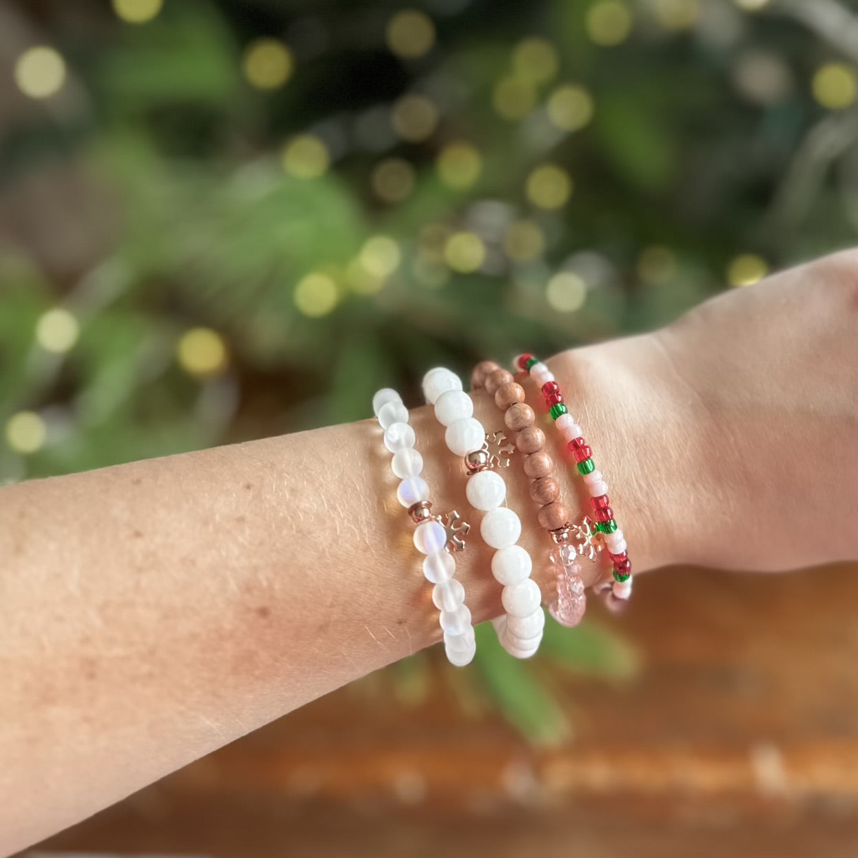 The Snowflake Bracelet Collection features three different stones. Howlite, Jade and Opalite with a beautiful rose gold snowflake charm that dresses them up with some sparkle for this Christmas season and throughout the winter season.