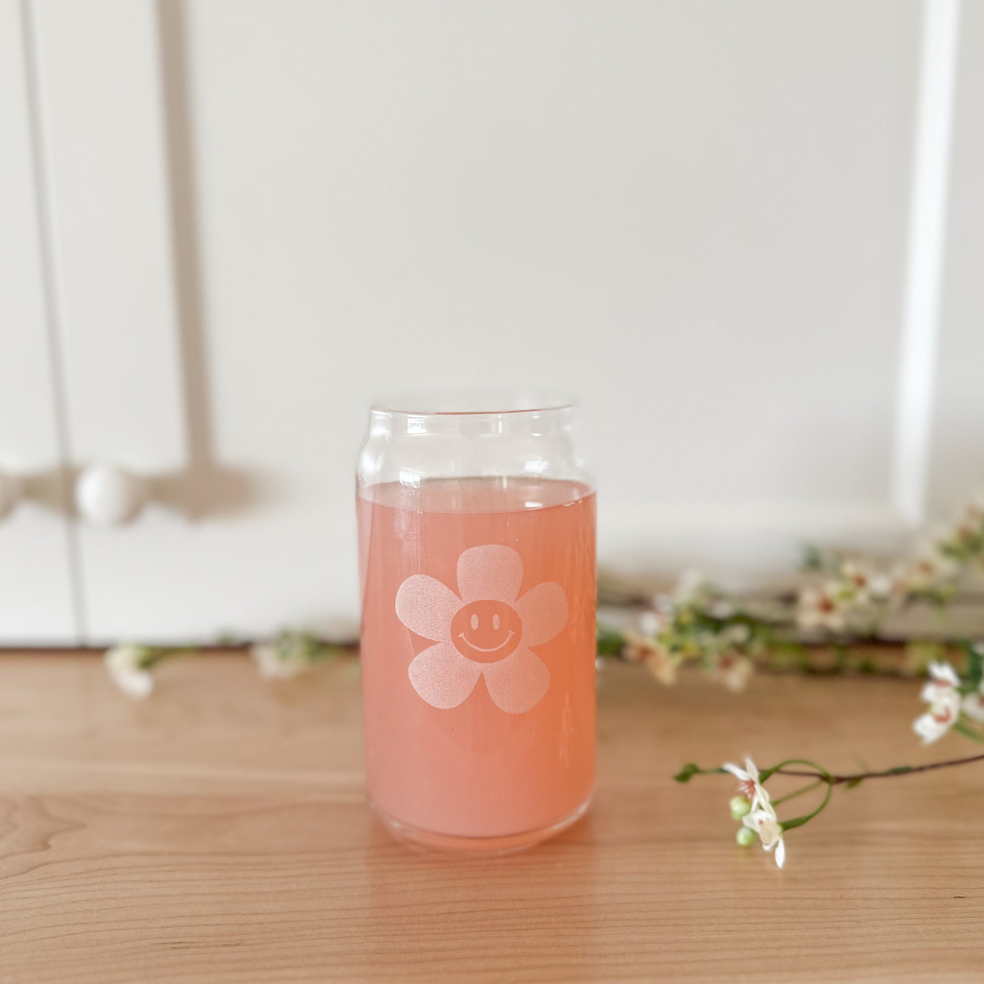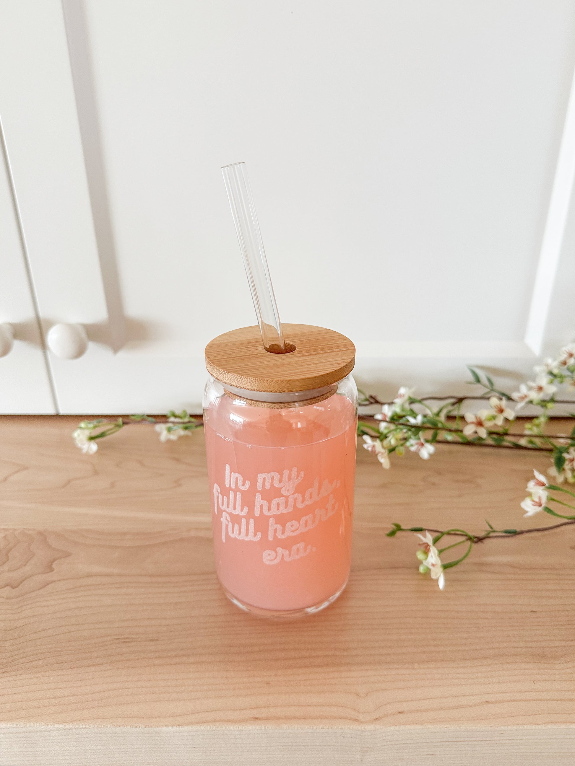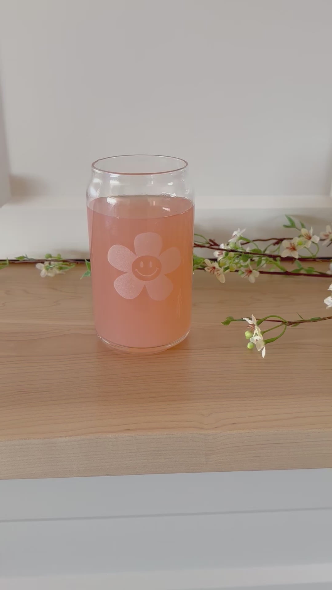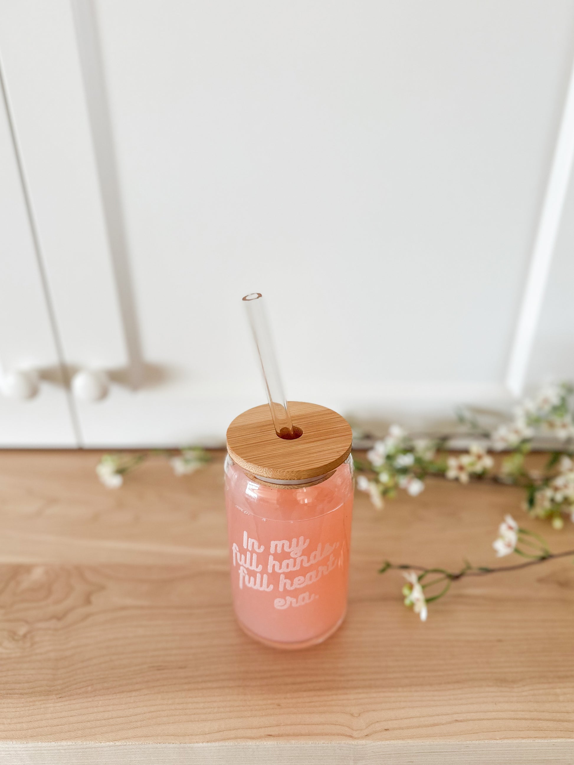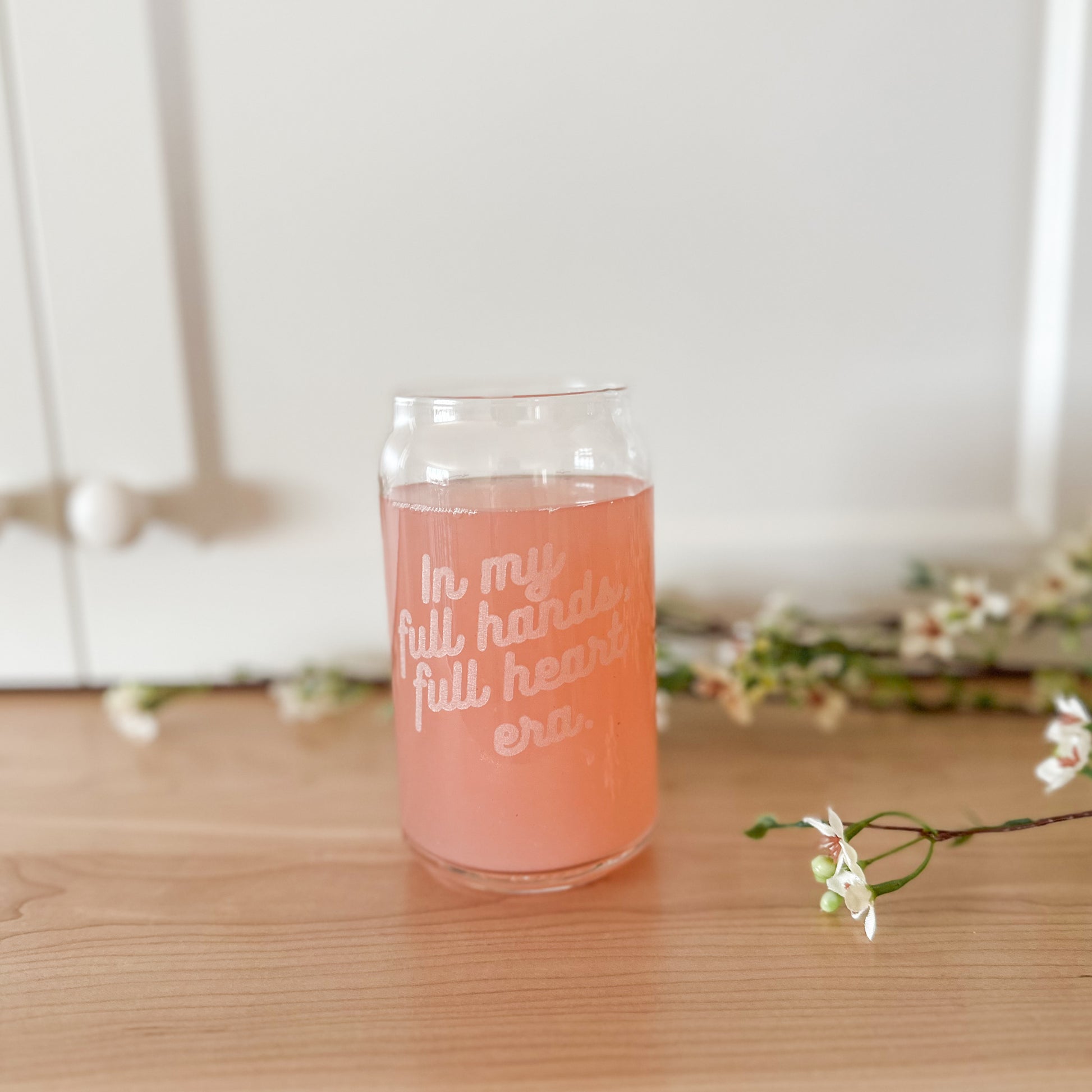 16 oz. drinking glass (full hands full heart… on one side, smiling flower on the other side). Guaranteed to bring you joy while you're sipping your iced coffee or fruity beverage :)