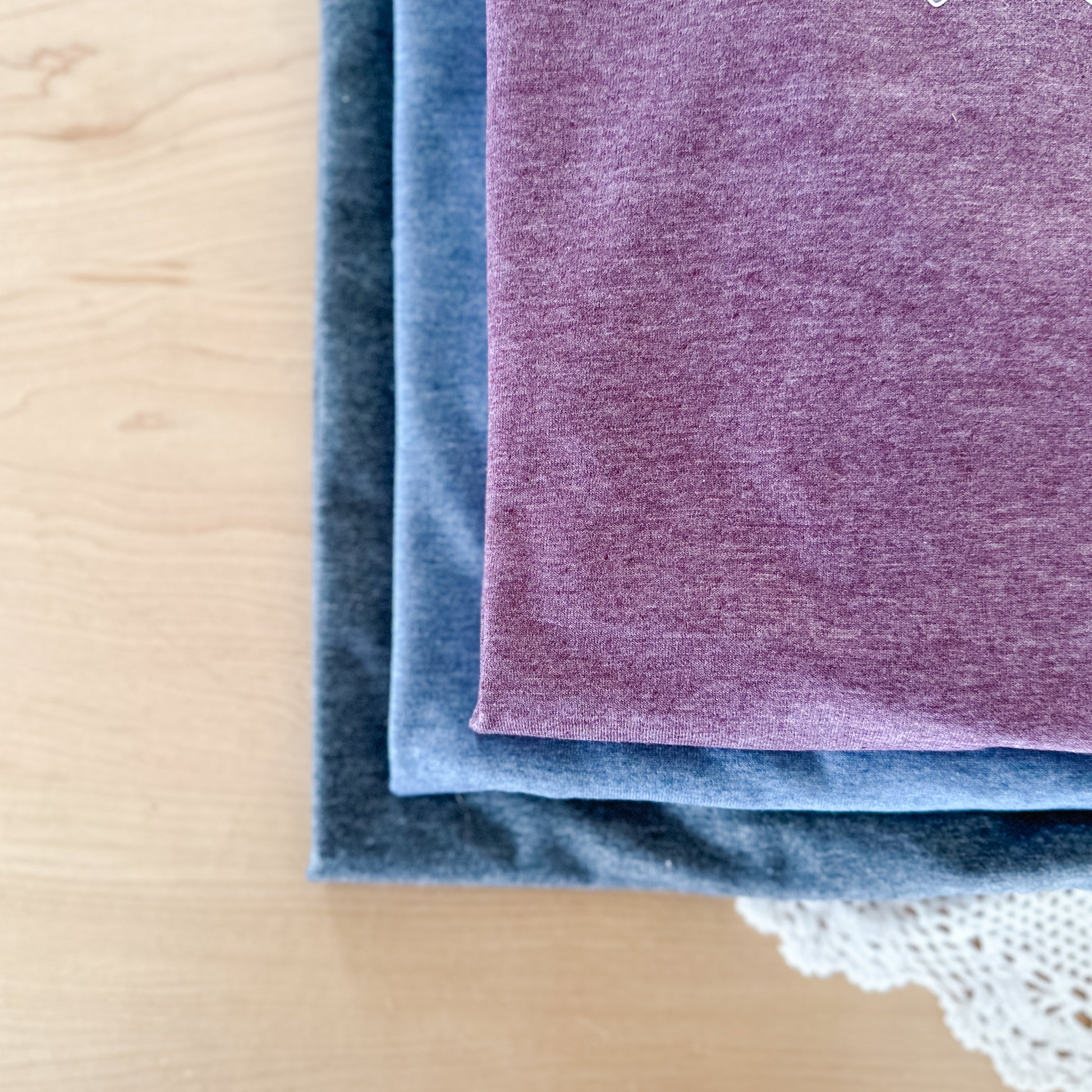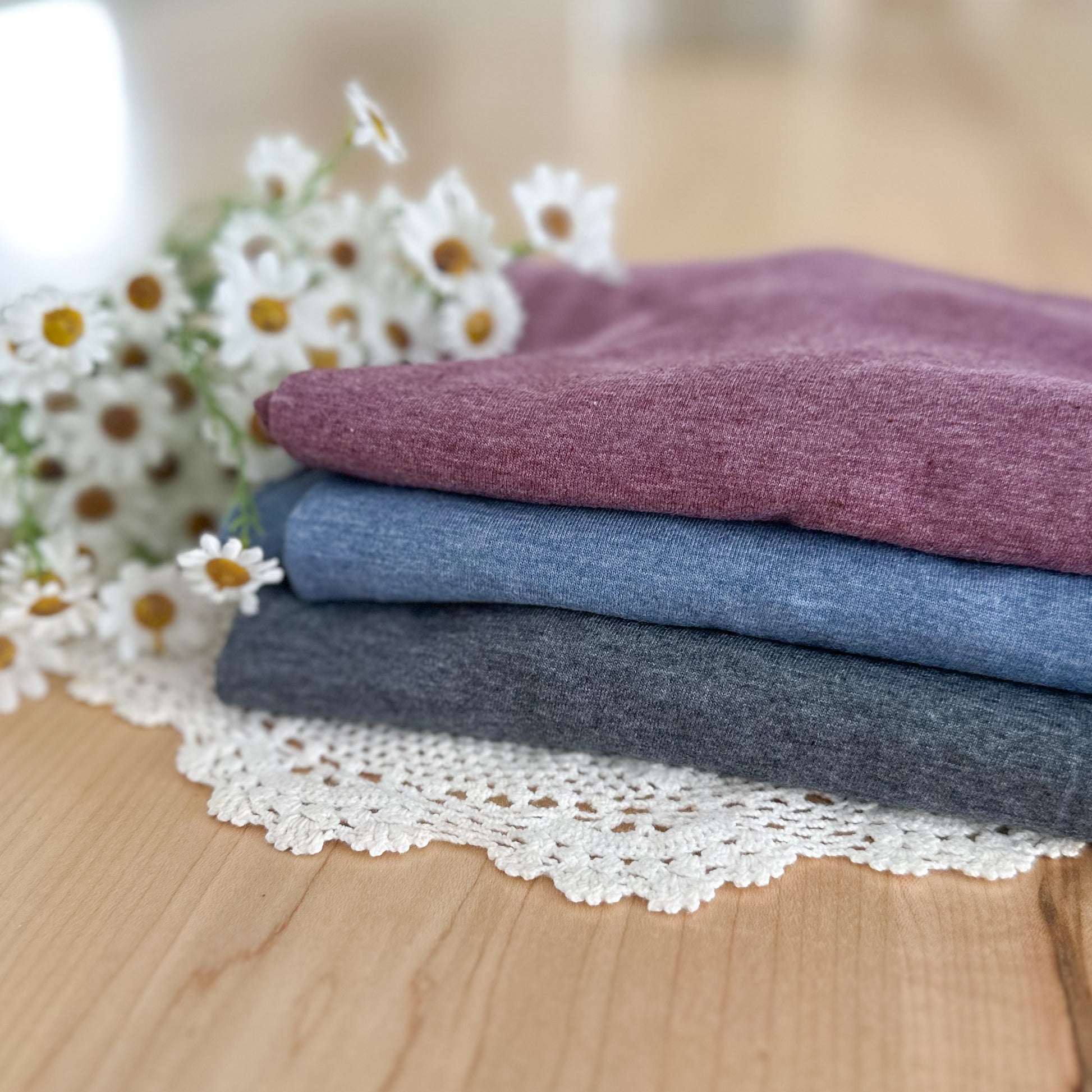 Choose between heather charcoal, heather blue or heather purple.