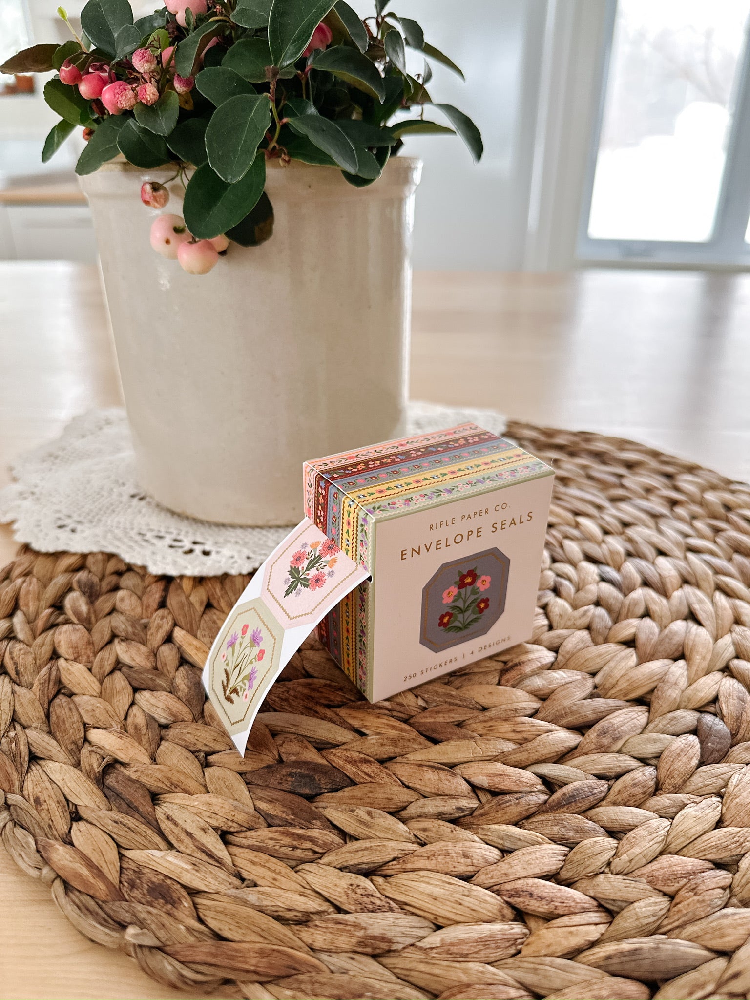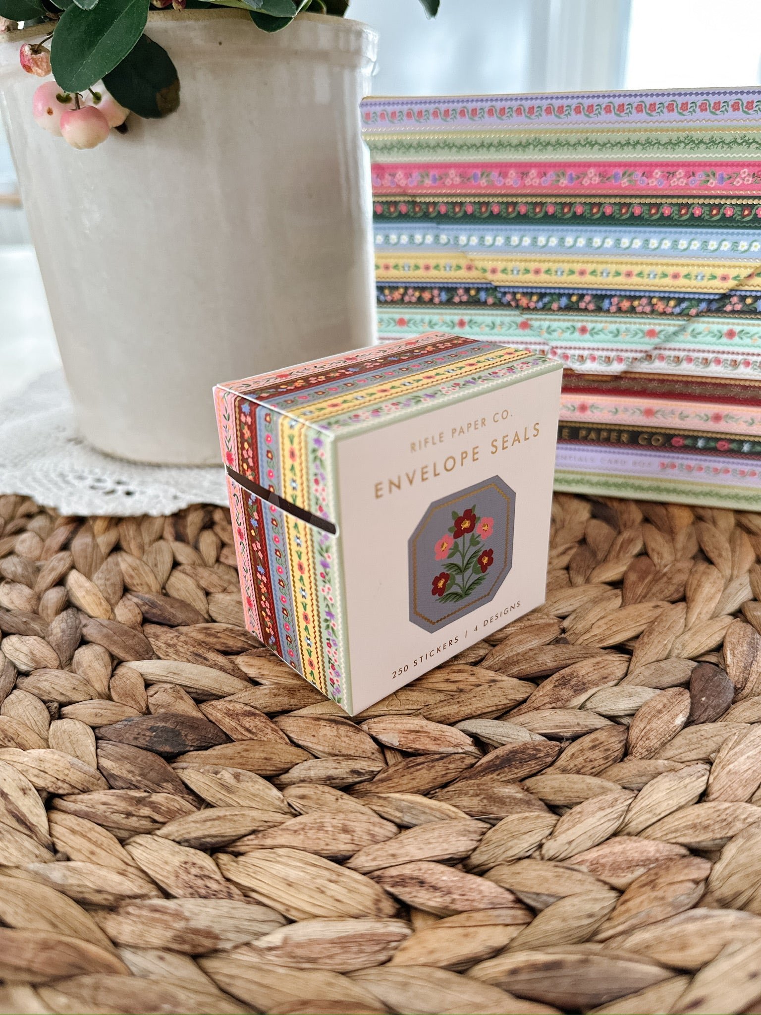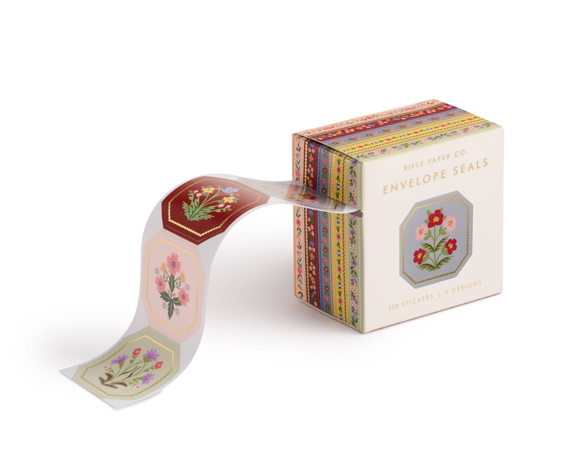 Add a special touch to your letters with these illustrated envelope seals, featuring four Gemma florals. Each roll of 250 seals is packaged in an easy-to-use box with a dispensing slot.