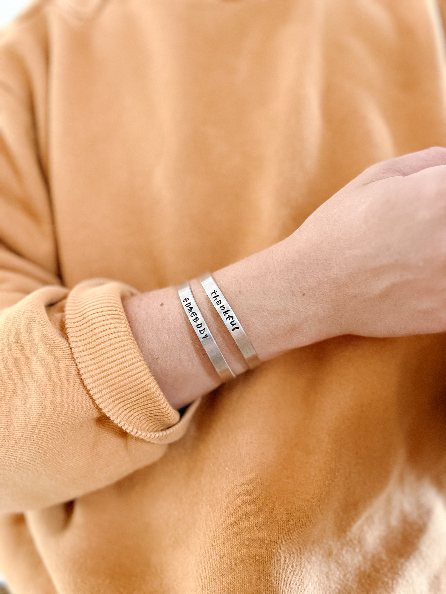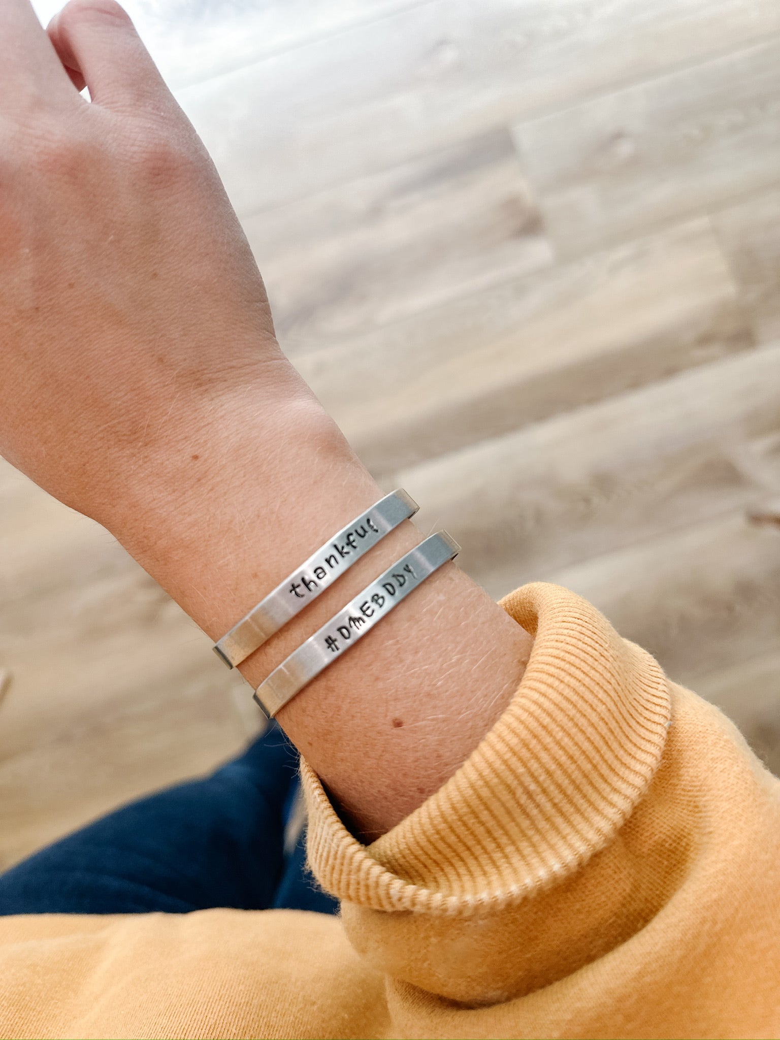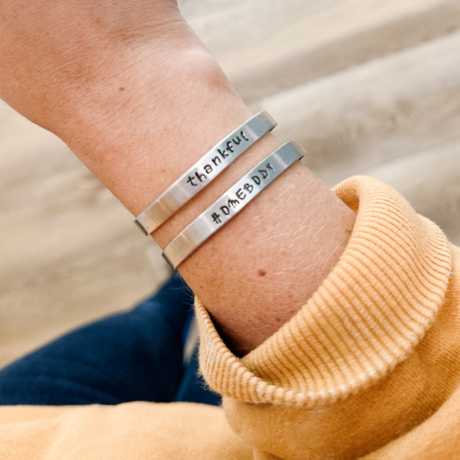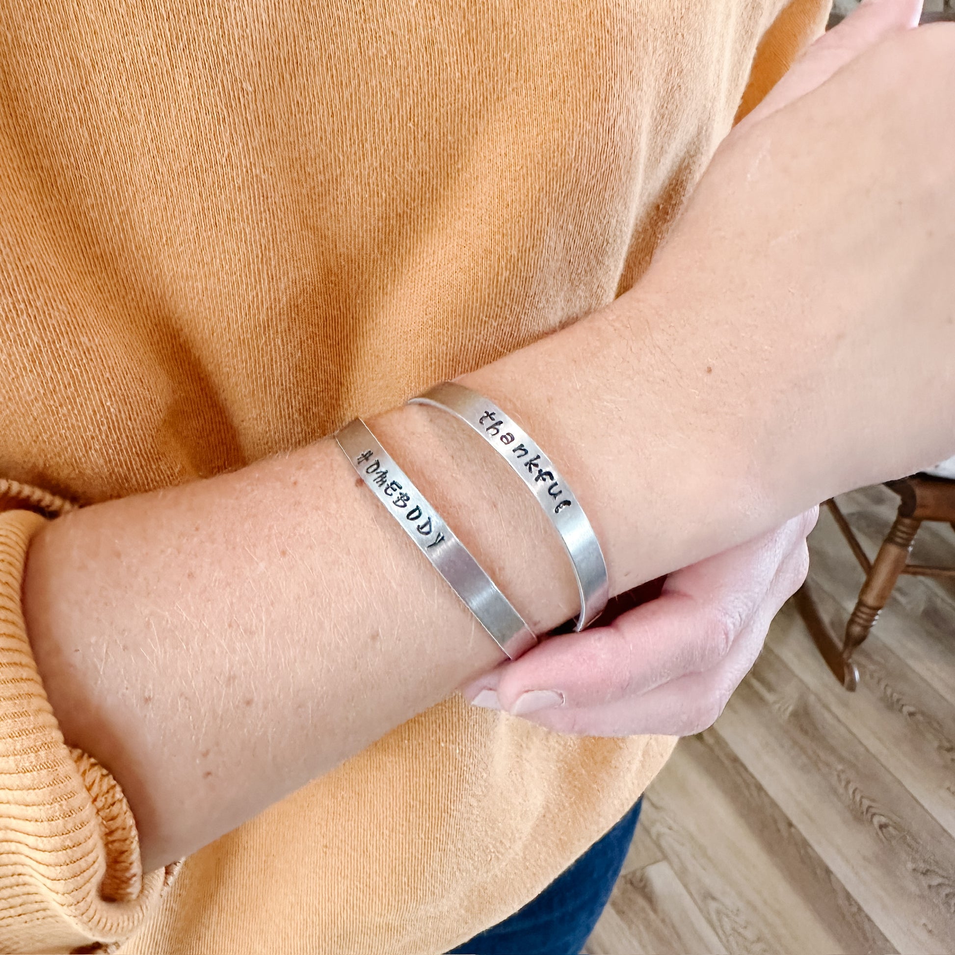 The perfect addition to your bracelet stack! Cuff style bracelets, available with homebody or thankful. Or contact us for custom orders. Hand stamped by RJ team member, Vanessa!