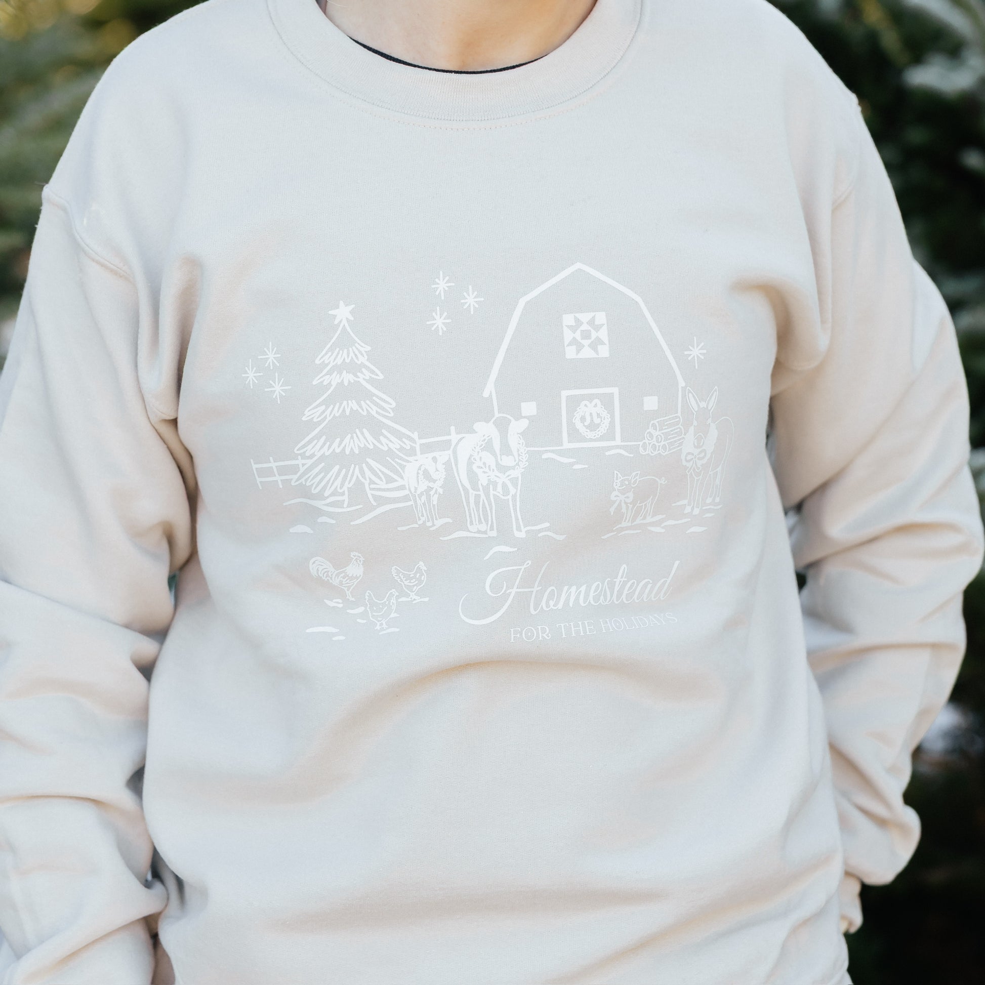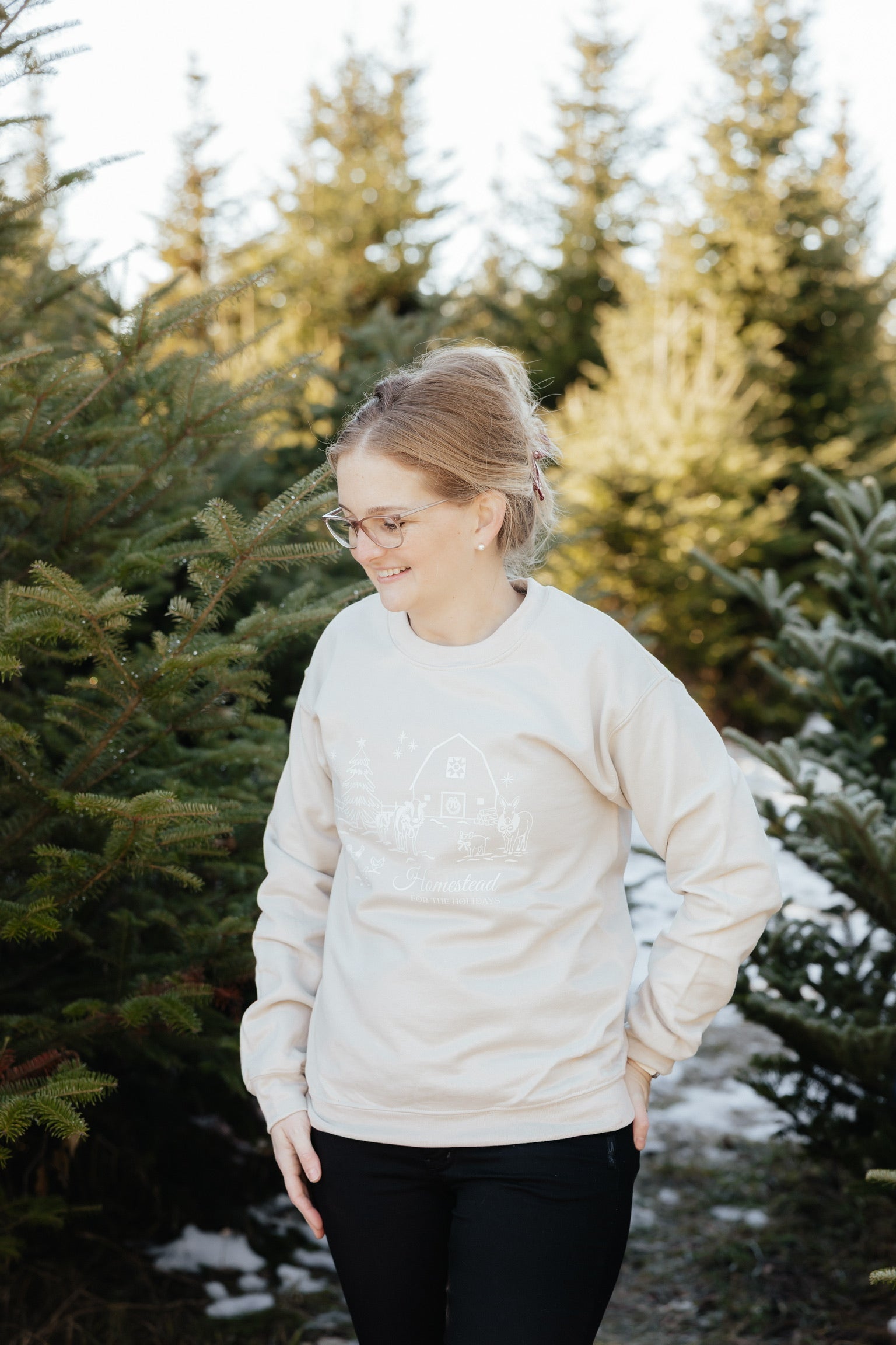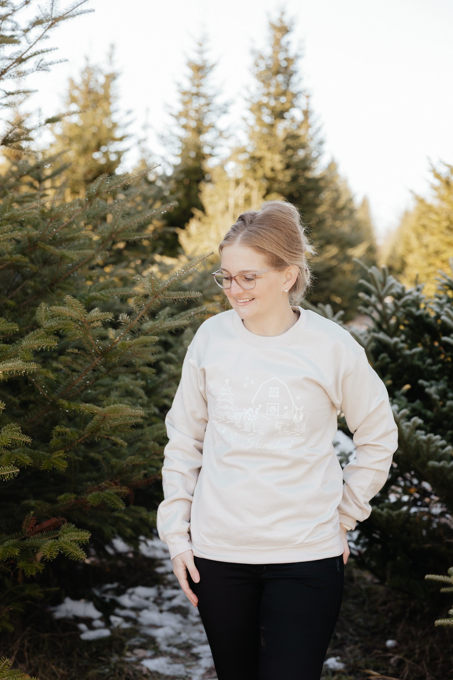 A cozy barnyard, festive trees, and a few familiar farm friends- and now, your new favourite snuggle season sweater! Whether you're sipping something warm under the tree or tucking into chores with a little Christmas cheer, these pieces were made to bring a little bit of Homestead magic to your Holidays.