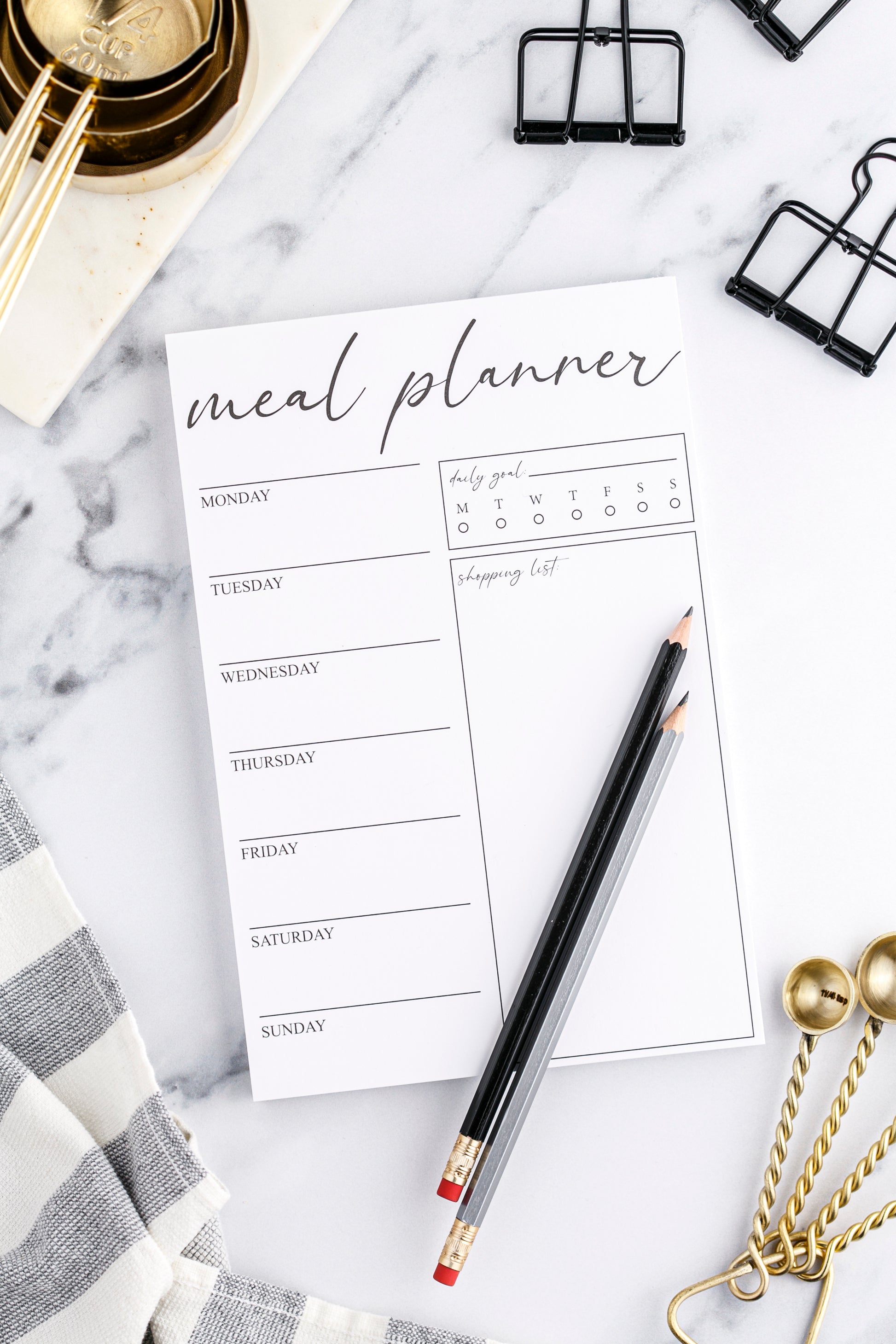 If "what are we having for dinner tonight?" is the most dreaded question in your house, get ready for your life to change. We designed this meal planner so that we could take the stress out of dinner: ingredients are purchased, freezer items are thawed in advance, and take out is no longer used as a last resort. We also made sure this is pretty enough to be kept on the fridge to refer to throughout the week, and included a place to keep track of your water consumption and weekly goals. Even better? Now you'll have more time to spend on things you actually enjoy, rather than figuring out what is for dinner. You're welcome!