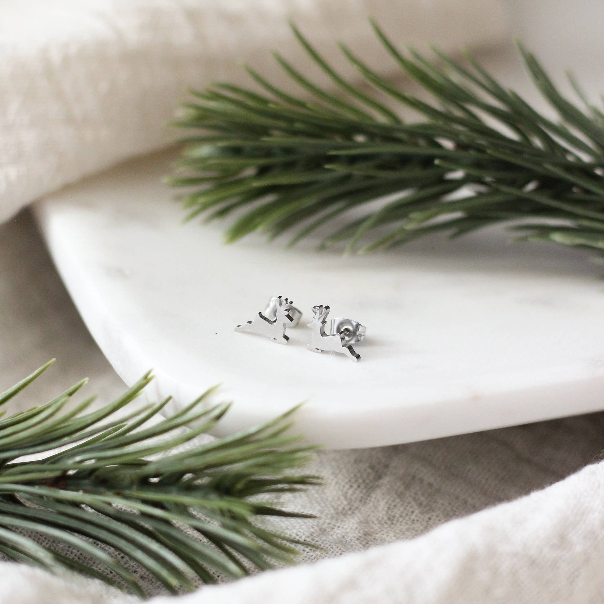 A minimalist pair of stainless steel studs featuring a reindeer design.