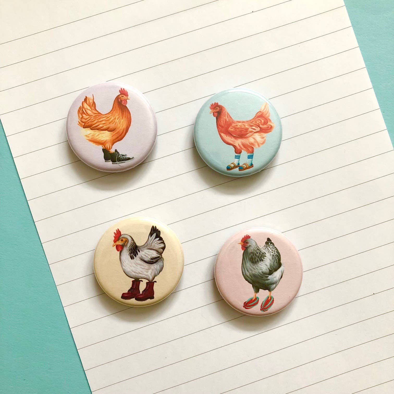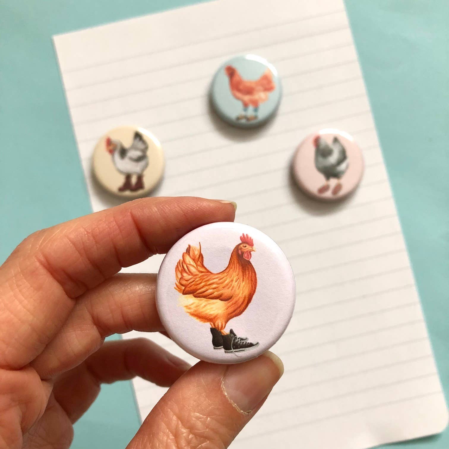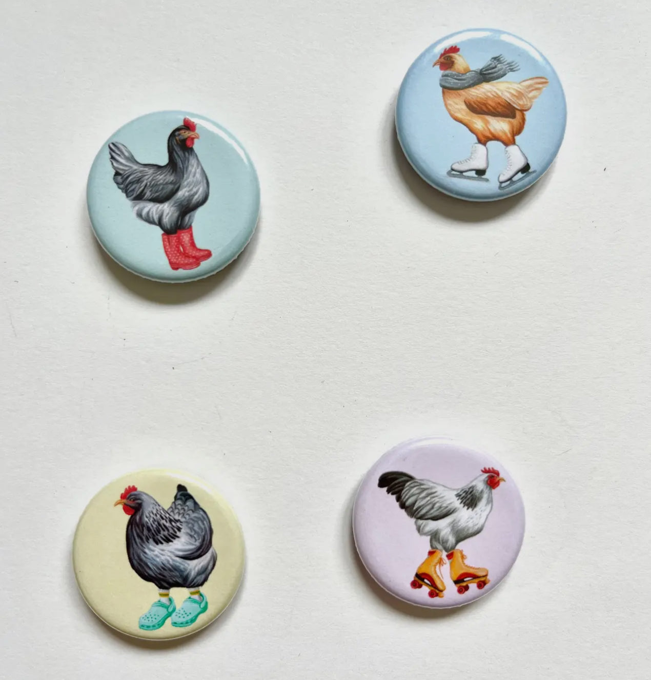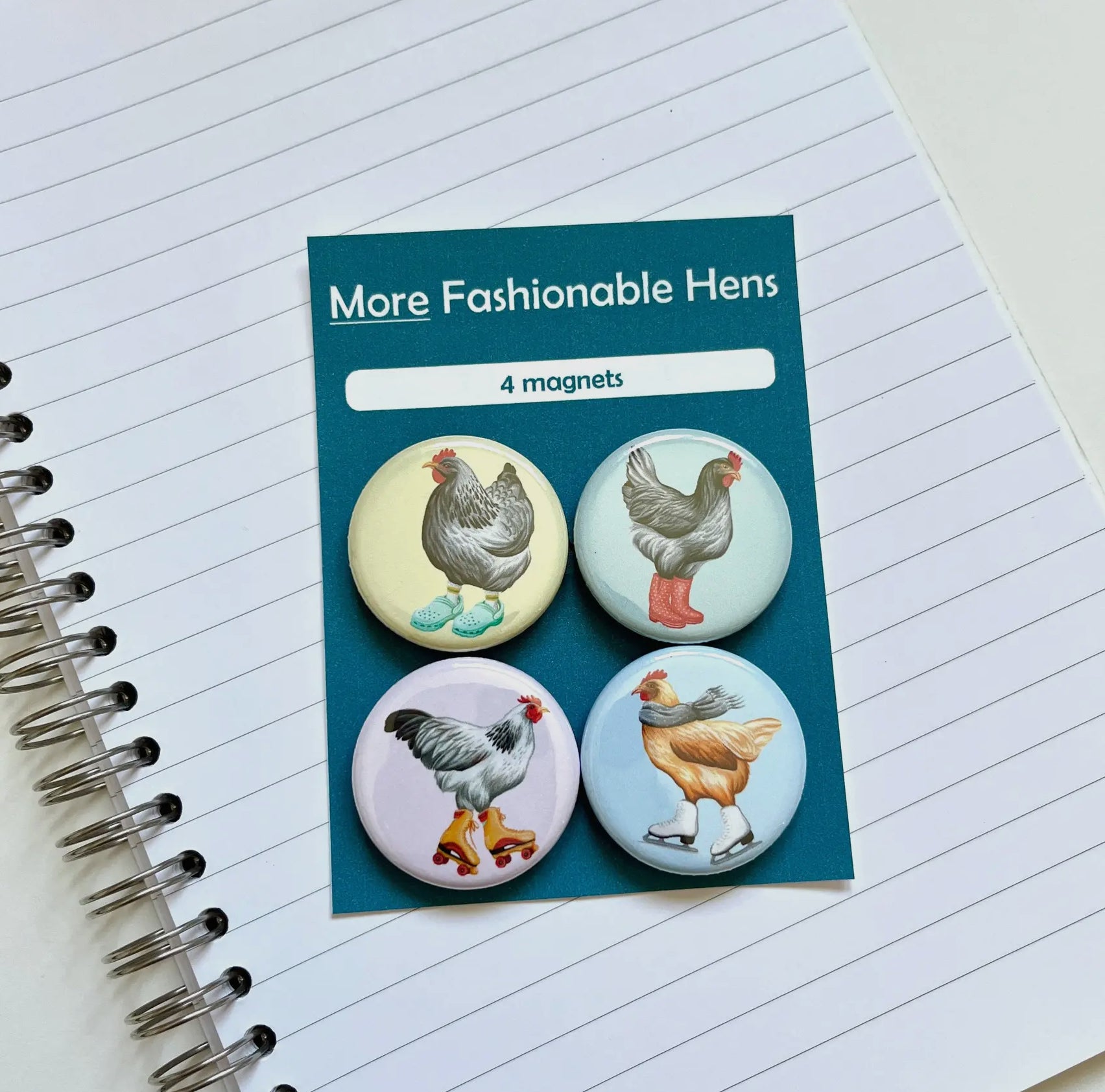 Set of 4 magnets with fashionable hens! Chickens wearing shoes! This a cute and perfect gift for hen lovers!