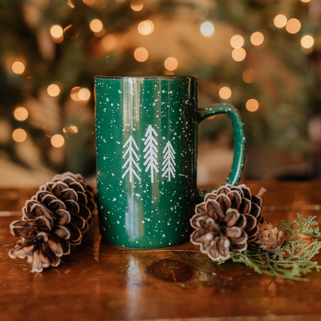 The Tall Speckle Camper Mug with (Hand-Drawn by Rudie) trees is such a charming and rustic, festive mug available in two beautiful colours - red and forest green. Select your mug choice in the drop-down.