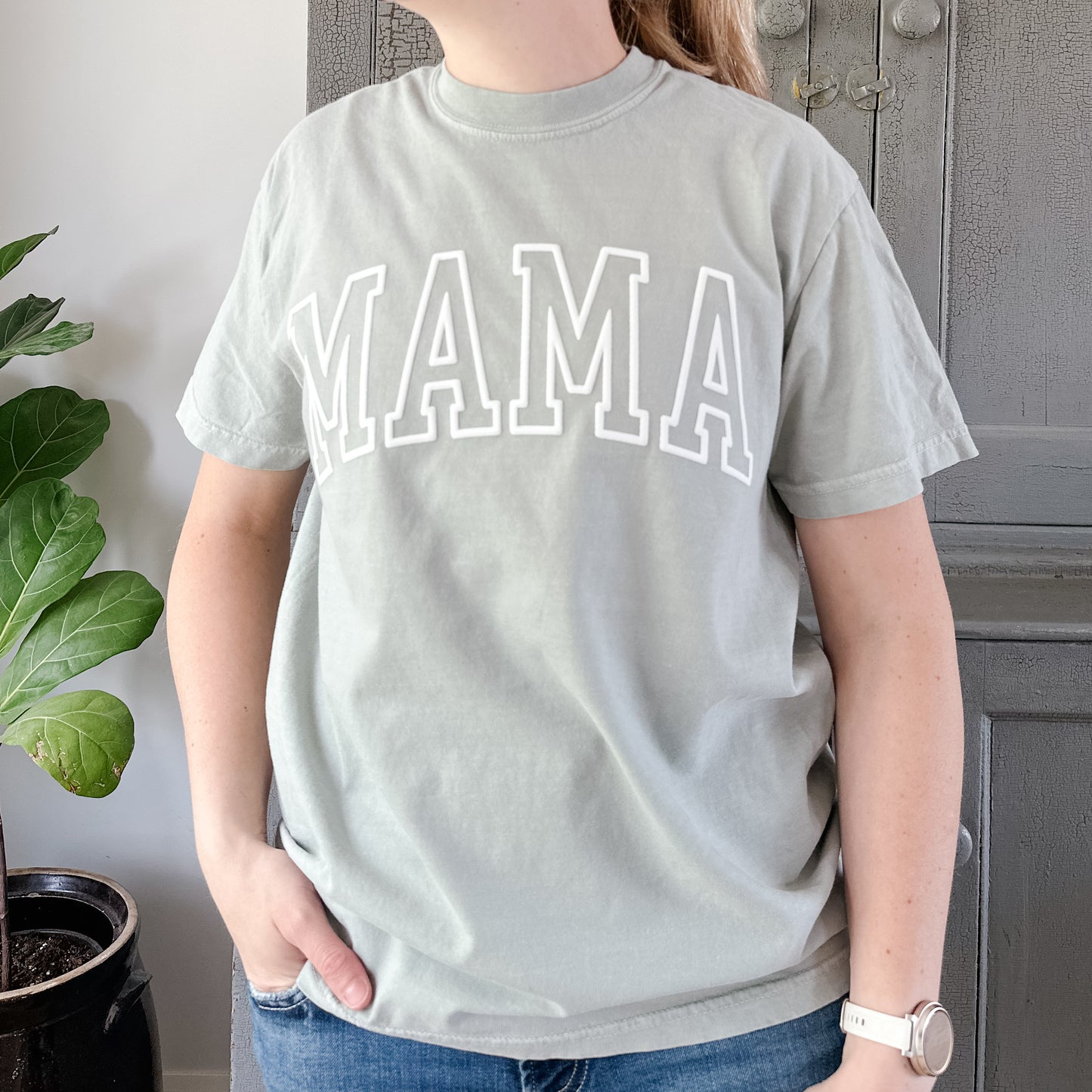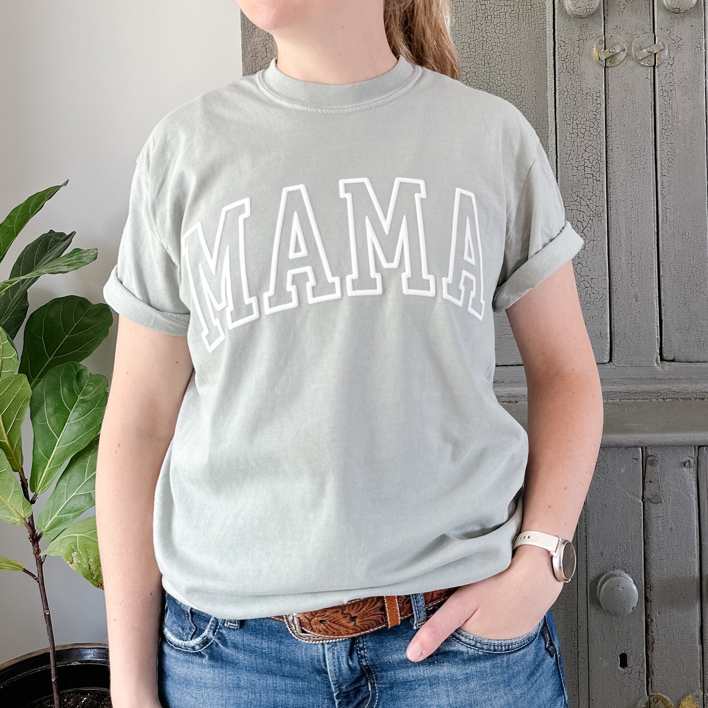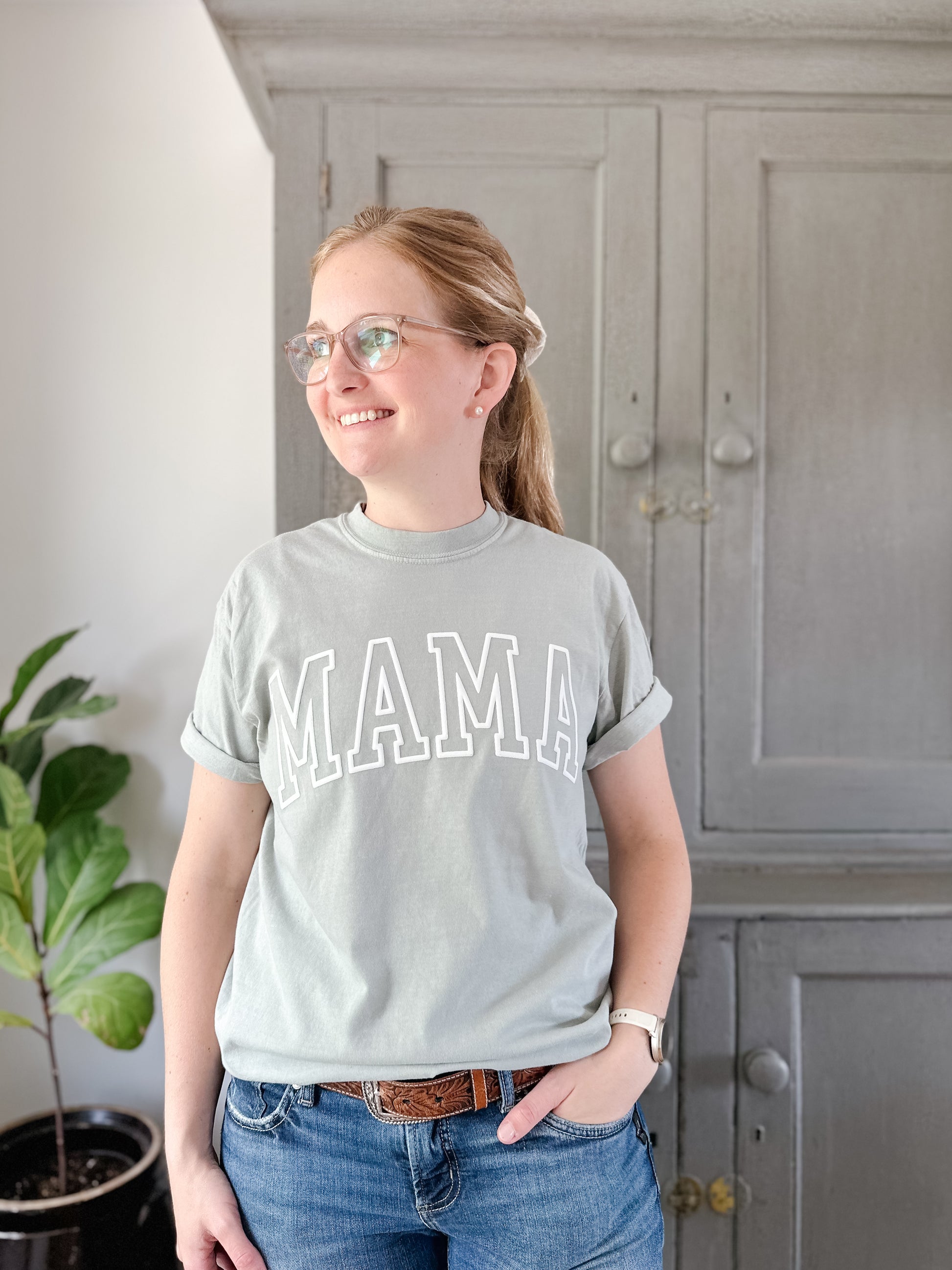A new mama tee on the prettiest sage colour with a varsity style PUFF font!