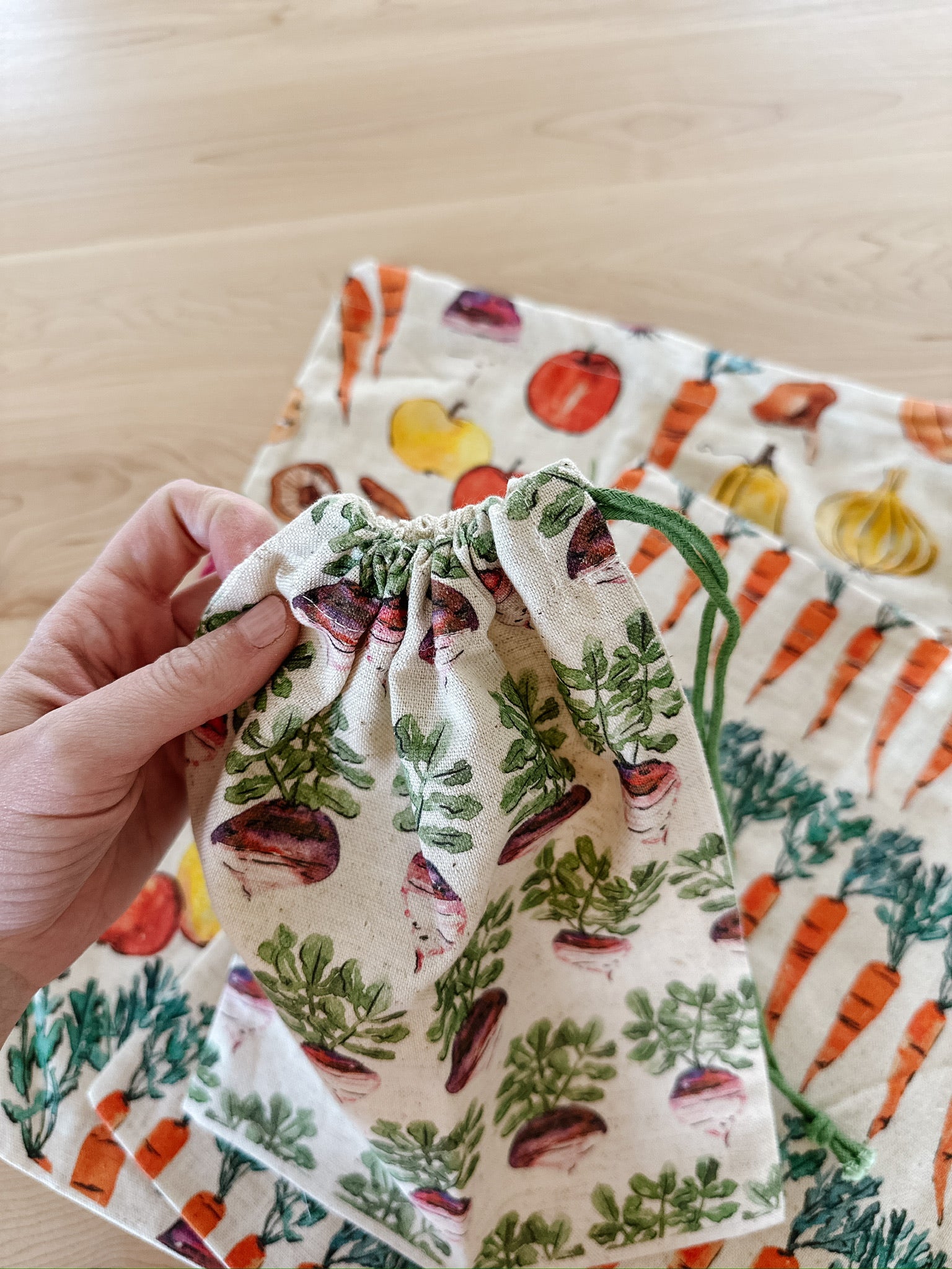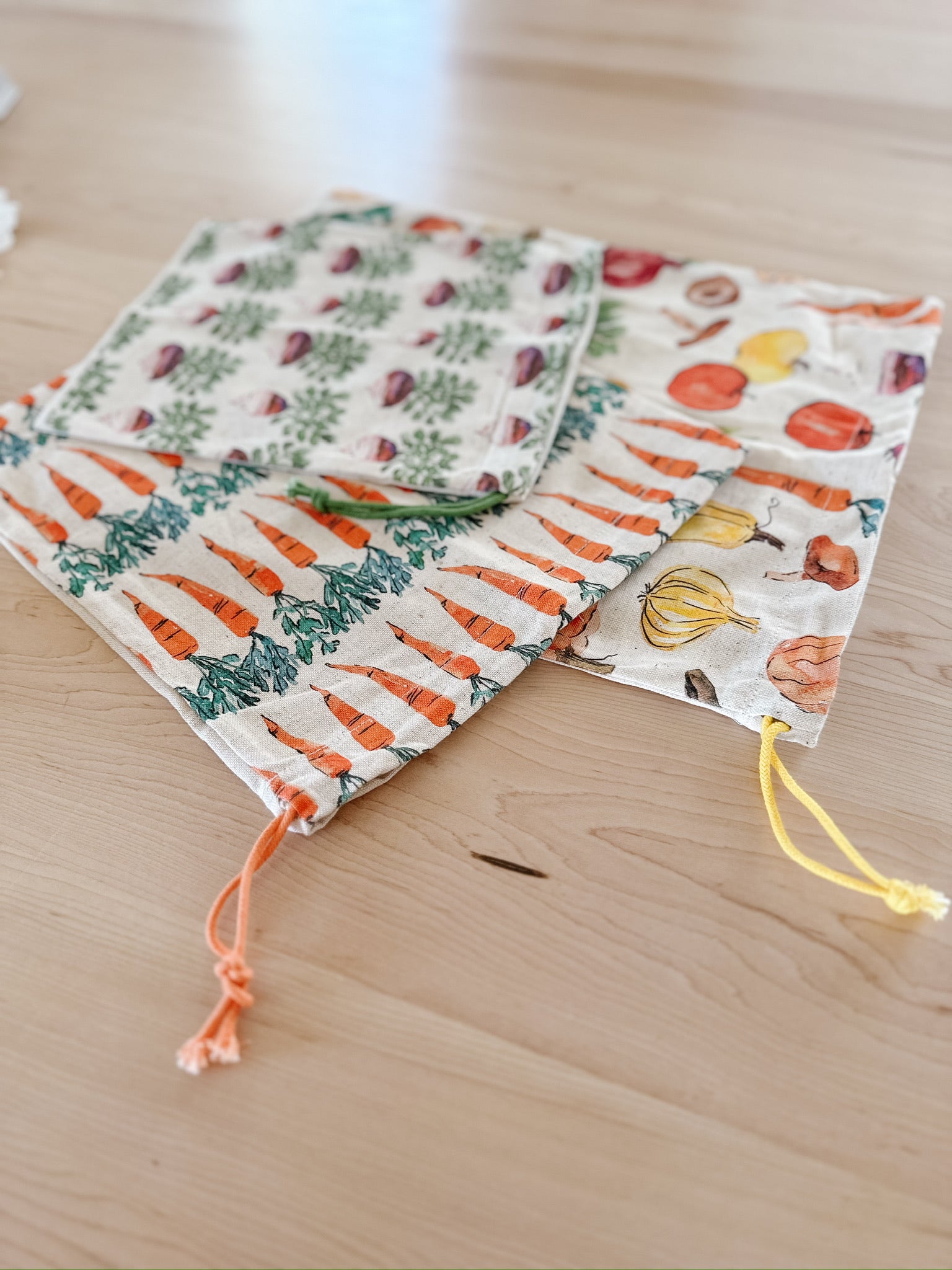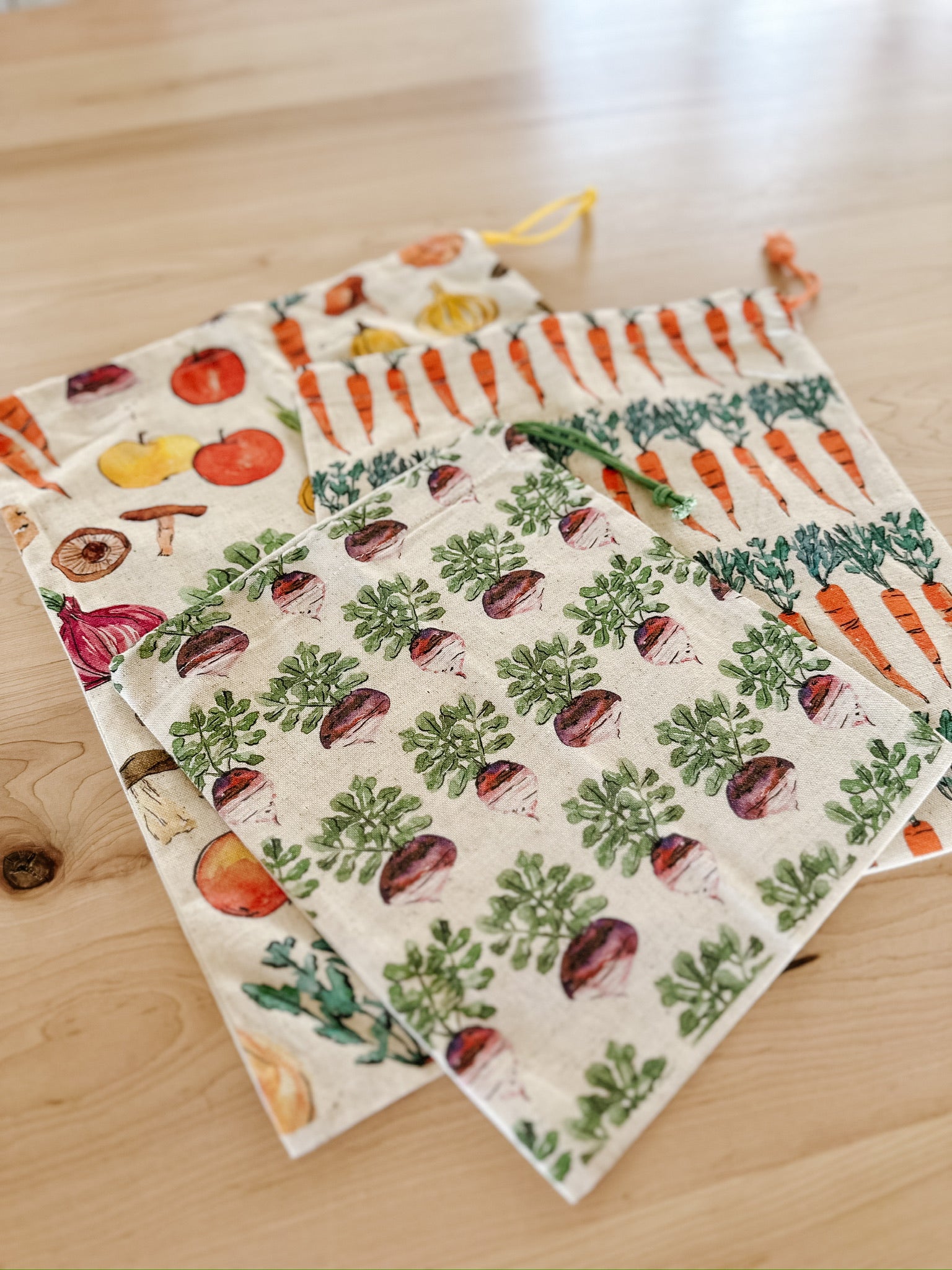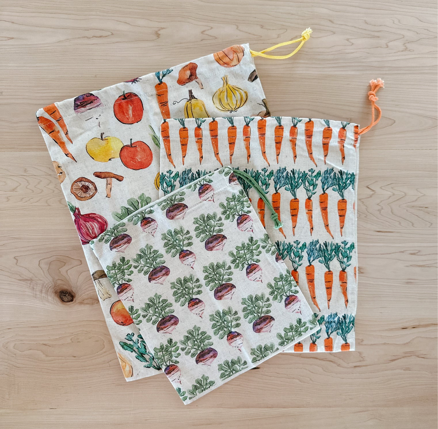Make grocery shopping waste-free with these reusable Veggie Stand cotton produce bags. A set of three different sizes allows you to fit a variety of fruits and vegetables.