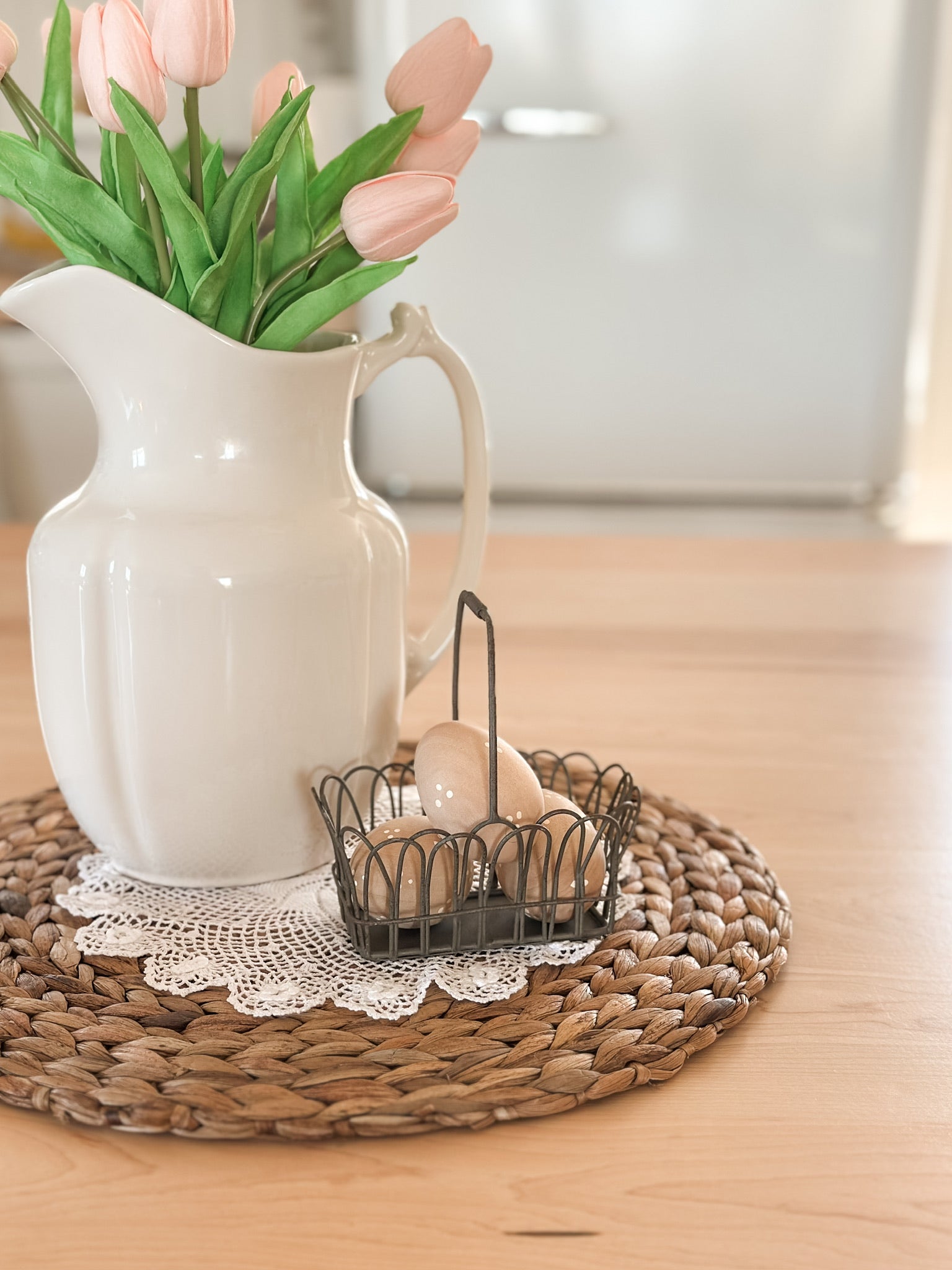These cute little wooden eggs were a last minute addition by Rudie herself. The simple, painted pattern will carry you through the whole spring season. They look adorable in a bowl, basket, or egg holder in your centerpiece.
