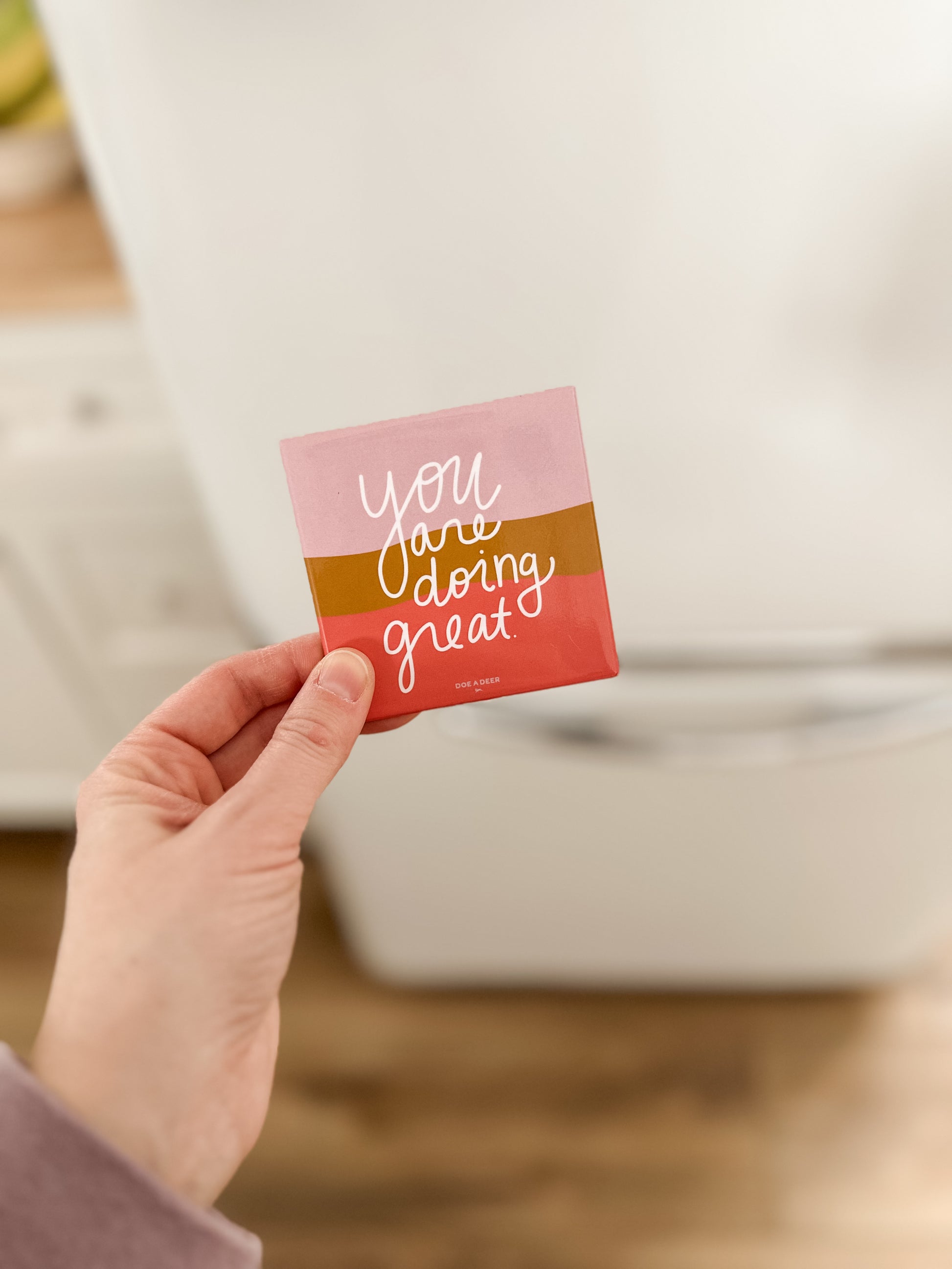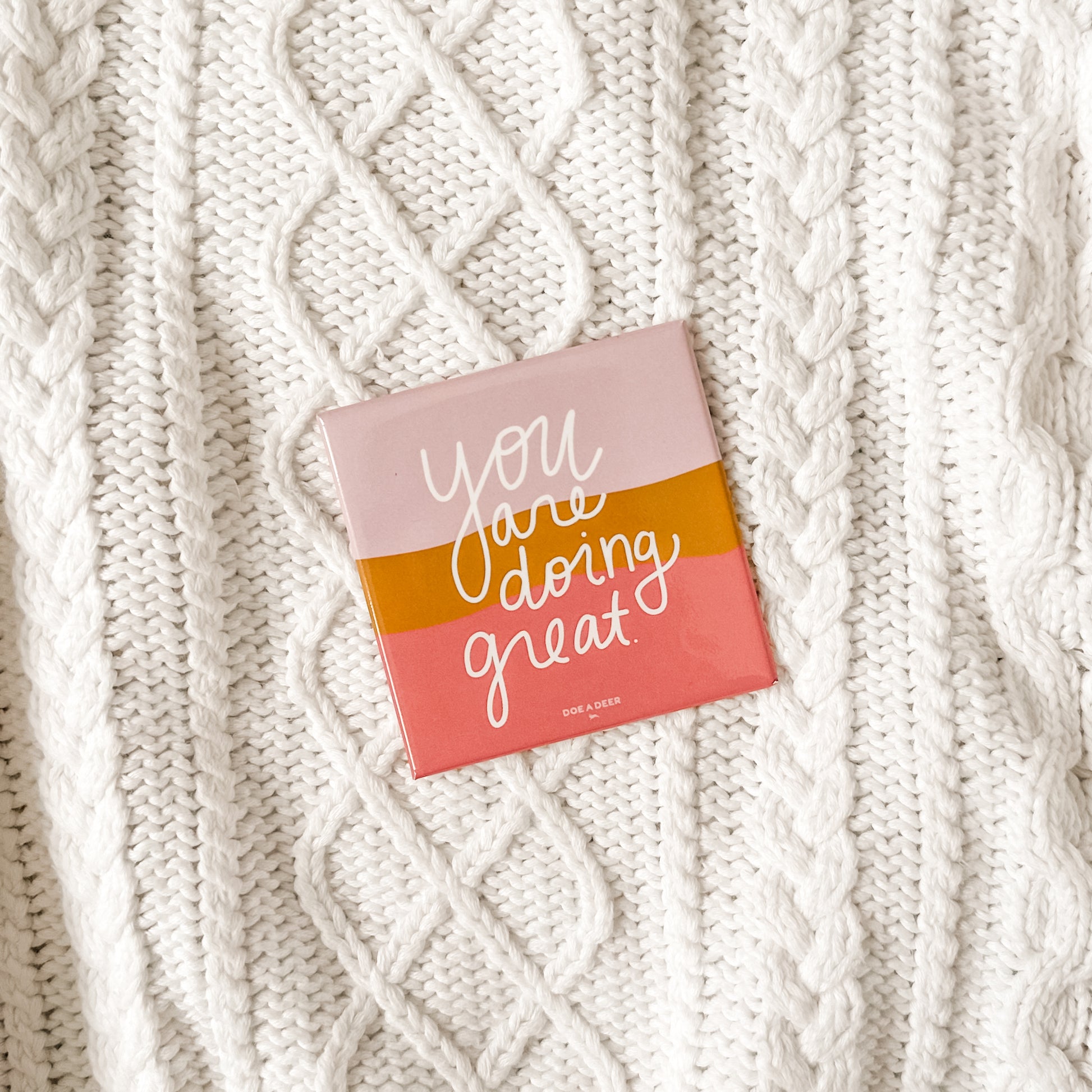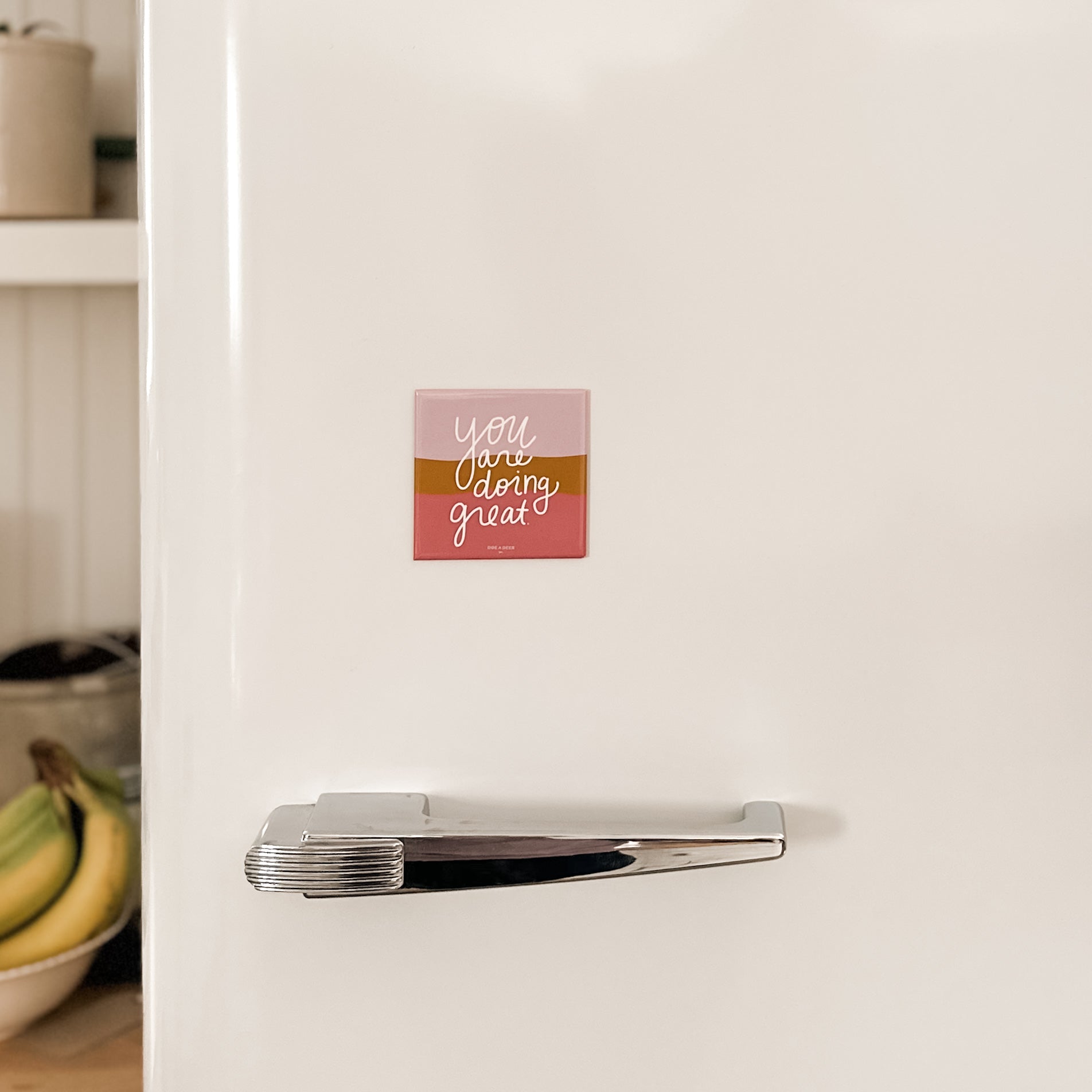 A pretty little magnet for ANYONE. This color blocking magnet featuring a sweet affirmation is something we ALL need to hear. You are doing great. Great for a new mom, mom sending kids to school, daughter needing a mid-year push to make it through midterms or finals, graduation, ‘thinking of you’ gift for a coworker…the opportunities are endless! Hard button-style magnet Entire back is magnetic.